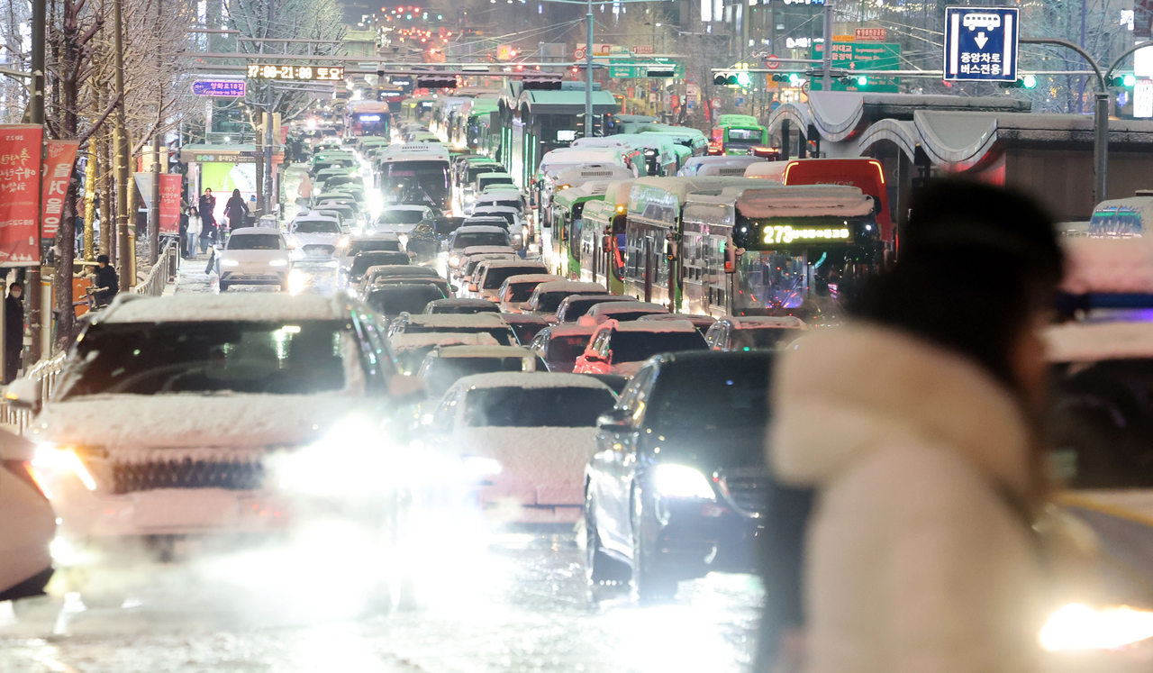 서울·인천·경기·강원 등 4개 시도에 대설특보가 발효된 지난 4일 서울 마포구 홍대입구역 인근에서 퇴근길 차량들이 눈길에 큰 정체를 빚고 있다. [연합] |