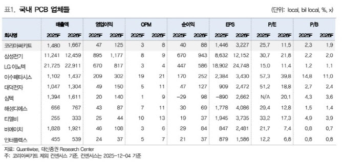 박 연구원은 “코리아써키트의 2026년 예상 주가수익비율(P/E)은 11.5배이며 컨센서스 기준으로 이수페타시스는 39.8배, 대덕전자 18.8배, 심텍 20.1배, 티엘비 17.3배, 해성디에스 12.8배와 비교하면 저평가로 인식된다”고 말했다.