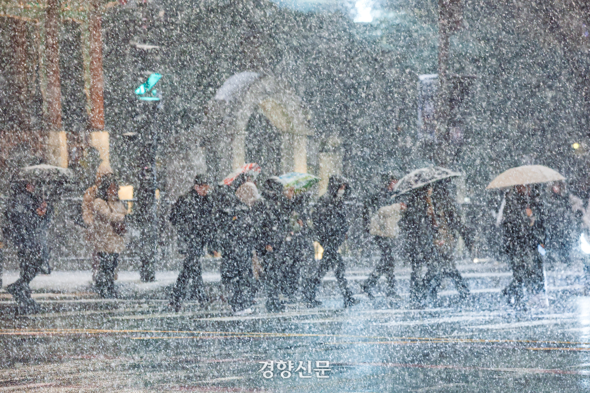 서울 전역에 대설주의보가 내려진 지난 4일 저녁 시민들이 눈발을 헤치며 서울 세종로 사거리 일대를 지나고 있다. 권도현 기자 |