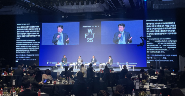김동찬 삼양식품 대표가 월드푸드테크포럼 기조세션에서 불닭볶음면 성공 비결을 발표하고 있다. |