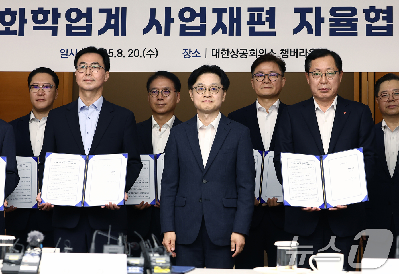 김정관 산업통상자원부 장관이 20일 오후 서울 중구 대한상공회의소에서 열린 석유화학업계 사업재편 자율협약식에서 이영준 롯데케미칼 사장, 김상민 LG화학 석유화학부문 본부장 등 참석자들과 협약서를 들고 기념촬영을 하고 있다. 2025.8.20/뉴스1 ⓒ News1 김민지 기자 |