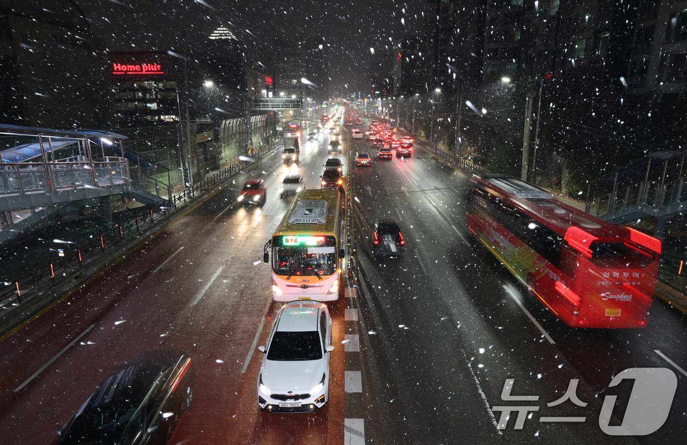 서울 전역을 포함한 수도권에 대설주의보가 내려진 4일 오후 경기 화성시 송화초등학교 인근 경기대로에 많은 눈이 내리고 있다. 2025.12.4/뉴스1 ⓒ News1 김영운 기자 |