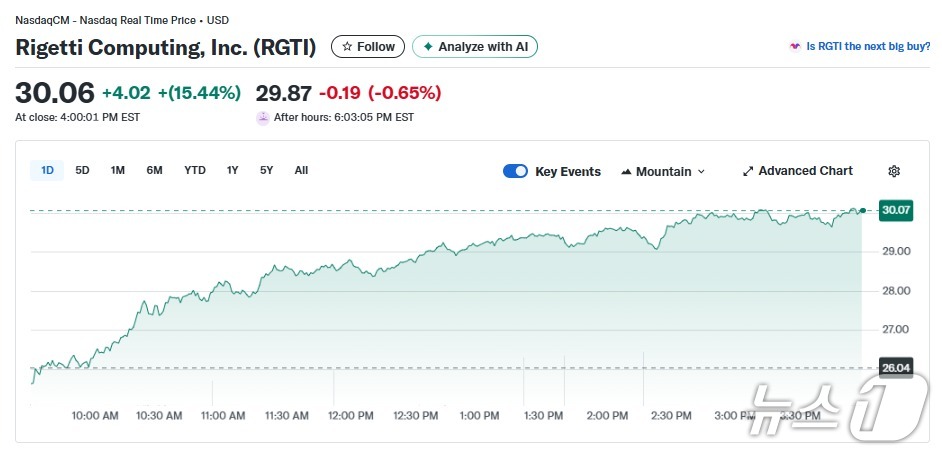 4일(현지 시각) 뉴욕증시에서 리게티는 15.44% 폭등한 30.06달러를 기록했다.