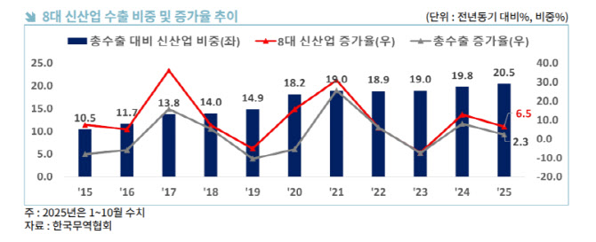 미국의 관세 부과로 대미 수출이 급감했던 자동차(1.6%)는 EU 등 미국 외 시장으로 수출이 다변화되면서 소폭 회복세를 유지할 것으로 예측됐다. 특히 한미 협상 타결로 인한 관세 인하 기대감으로 11월 대미 수출이 회복세(13.7%)로 돌아섰으며, 연말까지 대미 수출 부진이 점차 완화될 것으로 내다봤다. 다만 50%의 고율 관세가 부과된 철강(-9.4%)과 유가 하락으로 수출단가가 급락한 석유제품(-11.7%)은 연말까지 수출 부진이 이어질 전망이다.