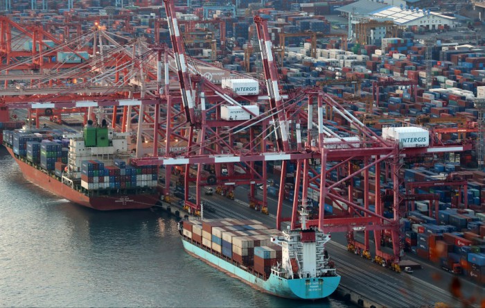 부산항 일대에 수출입 컨테이너가 쌓여 있는 모습 [사진=뉴스핌 DB] |