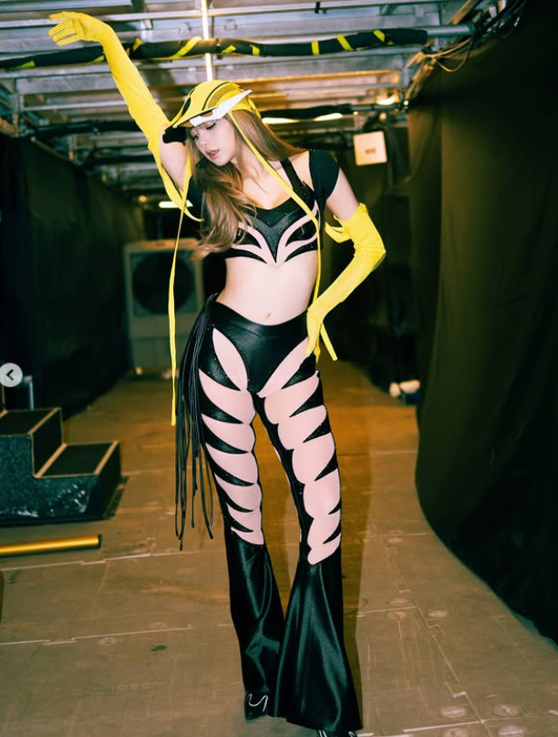 이날 공개된 사진에서 가장 눈길을 끈 건 단연 파격적인 무대의상이다. 사진 속 리사는 허리부터 다리 라인을 따라 대담한 컷아웃(절개) 패턴이 반복적으로 들어간 하의를 착용했다.