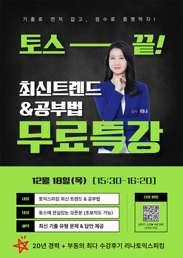 리나 강사는 "토익스피킹은 출제 유형이 빠르게 업데이트되는 시험이기 때문에 최신 트렌드를 아는 것이 중요하다"며 "이번 특강은 최신 정보를 한 번에 정리할 수 있는 유익한 시간이 될 것"이라고 말했다.