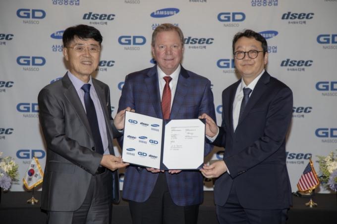 (오른쪽부터)강주년 삼성중공업 팀장, 데이비드 카버(David Carver) 제너럴다이내믹스 나스코(General Dynamics NASSCO·나스코) 사장, 윤석용 디섹(DSEC) 사장이 세계 워크보트쇼가 열린 미국 뉴올리언즈에서 만나 사업 협력 합의서를 체결했다./사진제공=삼성중공업 |