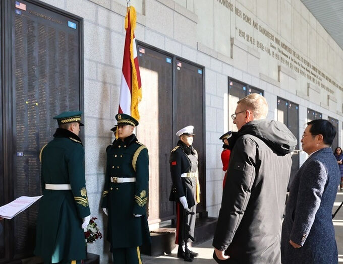 2024년 11월 29일 방한 중이던 에드가르스 린케비치 라트비아 대통령이 서울 용산 전쟁기념관을 찾아 미군 6·25 전쟁 전사자 명비에 헌화한 뒤 참전용사들 넋을 기리고 있다. 전쟁기념사업회 제공 |