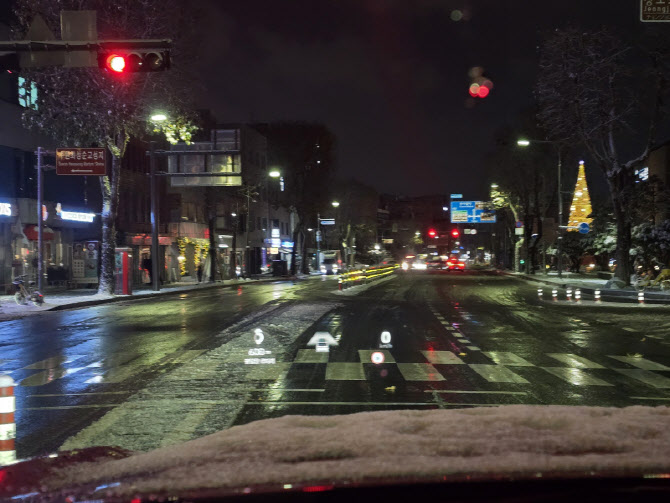 지난 4일 밤 9시 35분께 수원시 팔달구 도로 모습. 이날 오후 7시부터 발효된 대설주의보와 함께 수원시에 4.2cm 눈이 쌓였지만, 선제적인 제설 작업으로 도로 위 눈이 대부분 치워진 모습이다.(사진=황영민 기자) |