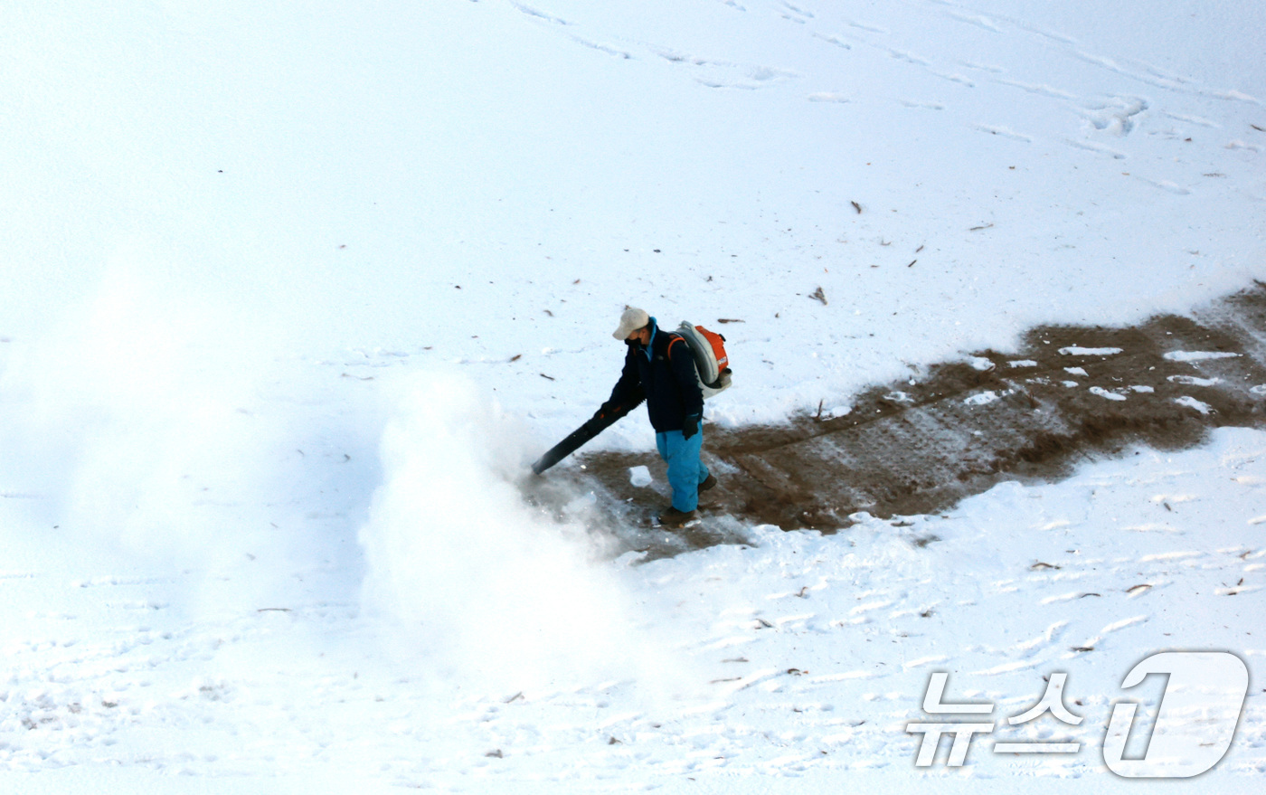 (서울=뉴스1) 임세영 기자 = 5일 서울 종로구 경복궁에서 관계자들이 밤새 내린 눈을 치우고 있다. 2025.12.5/뉴스1