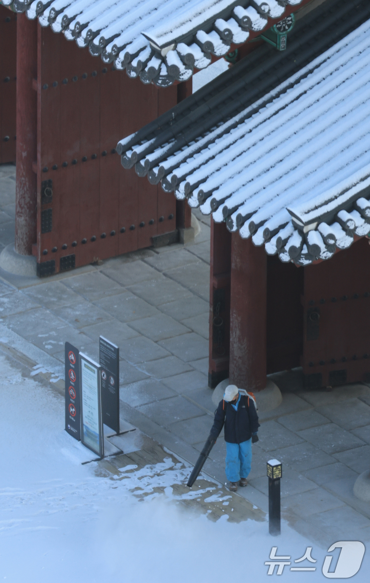 (서울=뉴스1) 임세영 기자 = 5일 서울 종로구 경복궁에서 관계자가 밤새 내린 눈을 치우고 있다. 2025.12.5/뉴스1