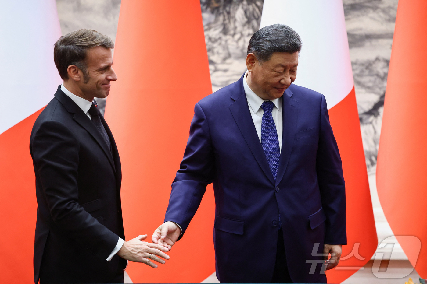 에마뉘엘 마크롱 프랑스 대통령이 4일 중국 베이징 인민대회당에서 시진핑 중국 국가주석과 악수를 나누고 있다. 2025.12.4 ⓒ 로이터=뉴스1 ⓒ News1 강민경 기자 |