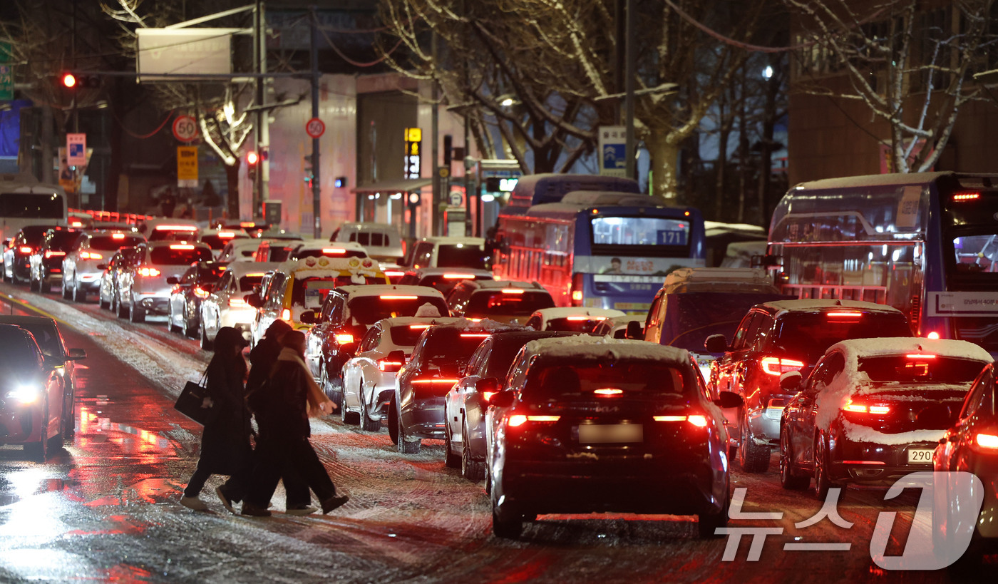 폭설이 내린 4일 오후 서울 종로구 안국동 도로의 차량들이 눈길에 큰 정체를 빚고 있다. 2025.12.4/뉴스1 ⓒ News1 이광호 기자 |