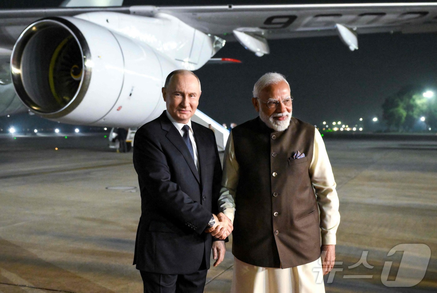 (뉴델리 AFP=뉴스1) 김경민 기자 = 블라디미르 푸틴 러시아 대통령이 4일(현지시간) 인도 뉴델리 팔람 공군기지에 도착해 나렌드라 모디 인도 총리의 영접을 받고 있다. 2025.12.4 ⓒ AFP=뉴스1