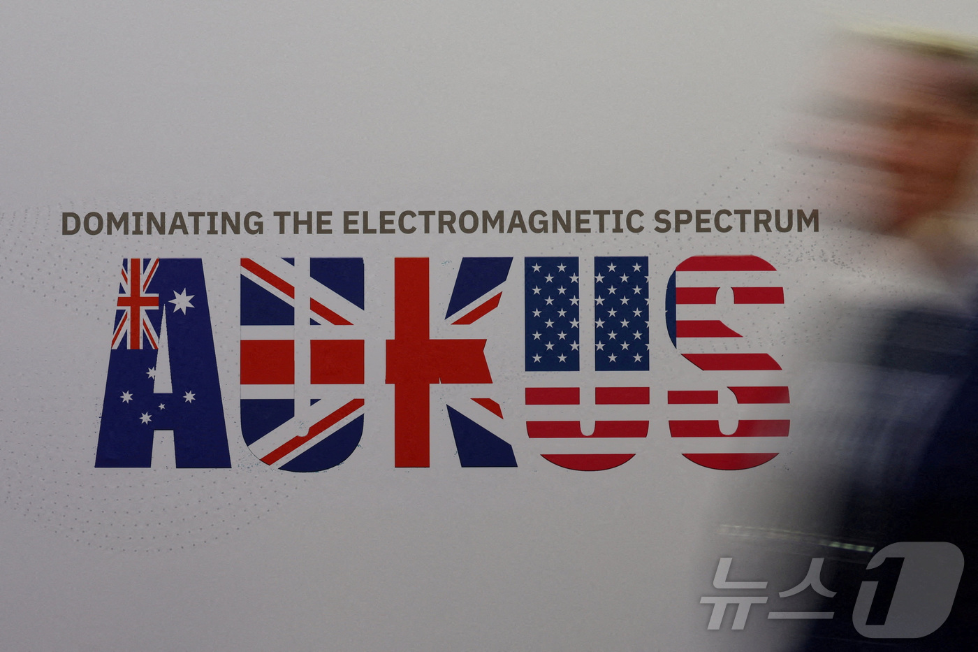 (시드니 로이터=뉴스1) 강민경 기자 = 호주 시드니에서 열린 인도태평양 국제해양전시회 첫날인 11월 4일 한 행인이 오커스 로고 앞을 지나가고 있다. 오커스는 미국과 영국, 호주의 안보 협의체다. 2025.11.4 ⓒ 로이터=뉴스1