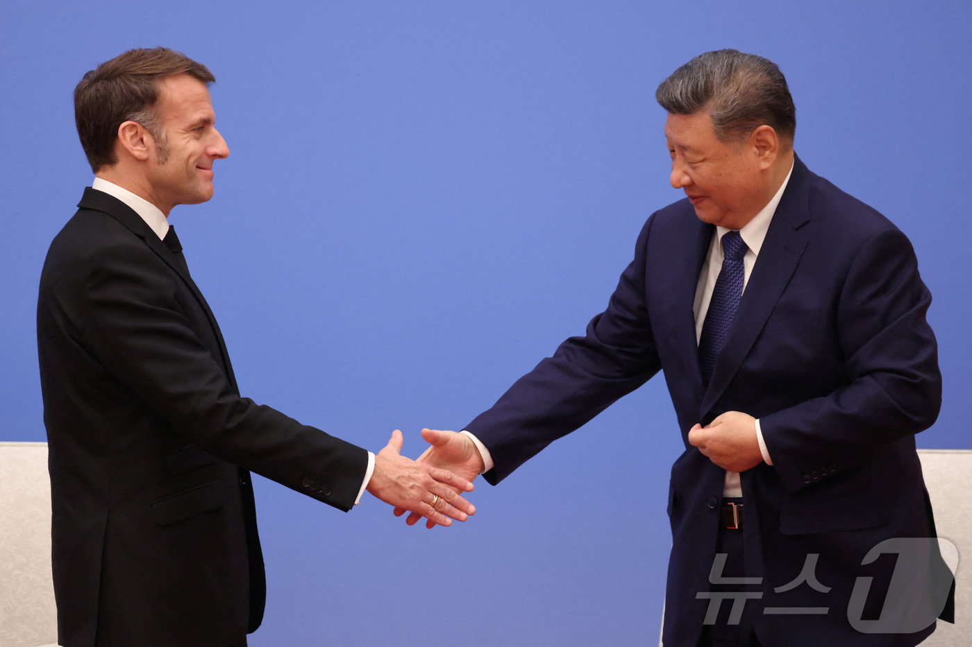 (로이터=뉴스1) 정은지 특파원 = 에마뉘엘 마크롱 프랑스 대통령과 시진핑 중국 국가주석이 4일 중국 베이징에서 열린 제7차 프랑스-중국 비즈니스 협의회 회의에서 악수를 하고 있다. ⓒ 로이터=뉴스1