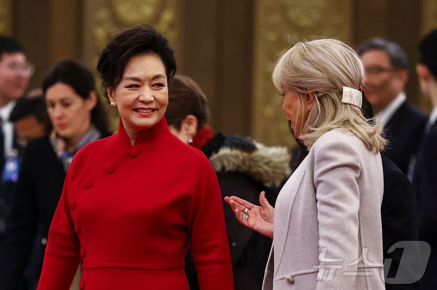 (베이징 AFP=뉴스1) 양은하 기자 = 4일(현지시간) 베이징 인민대회당에서 열린 환영식에 시진핑 중국 국가주석의 부인 펑리위안(왼쪽)과 에마뉘엘 마크롱 프랑스 대통령의 부인 브리짓 마크롱(오른쪽)이 참석하고 있다. 2025. 12. 04. ⓒ AFP=뉴스1