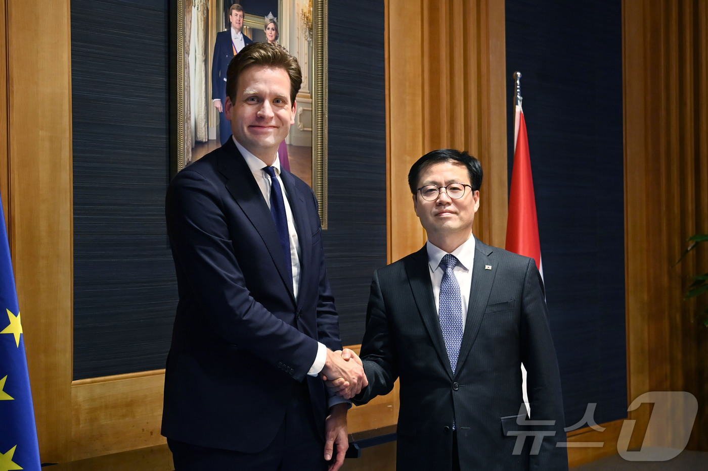 (서울=뉴스1) = 여한구 산업통상자원부 통상교섭본부장이 3일(현지시간) 네덜란드 덴하그에서 빈센트 피터 헤르트 카레만스 네덜란드 경제부 장관을 면담하고 기념 촬영하고 있다. (산업통상자원부 제공. 재판매 및 DB 금지) 2025.12.5/뉴스1