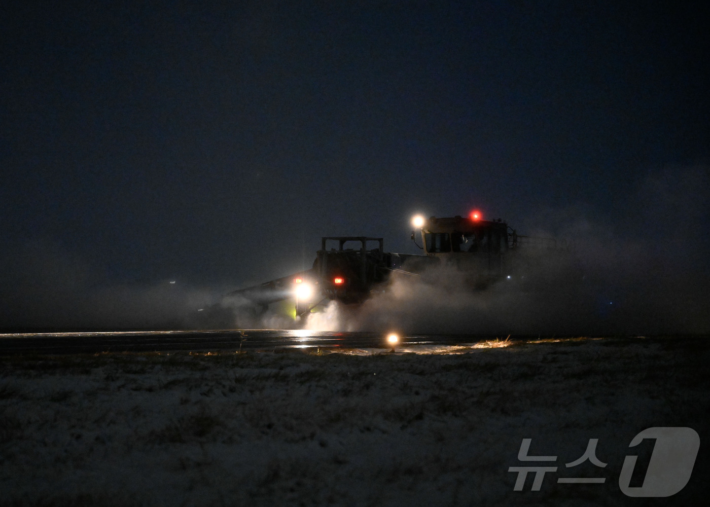 (서울=뉴스1) = 전국 곳곳에 이번 겨울 첫눈이 내린 4일 공군 수원기지에서 퇴역한 전투기 엔진을 활용해 제작된 특수제설차량 SE-88이 활주로 제설작전을 실시하고 있다. (공군 제공. 재판매 및 DB 금지) 2025.12.5/뉴스1