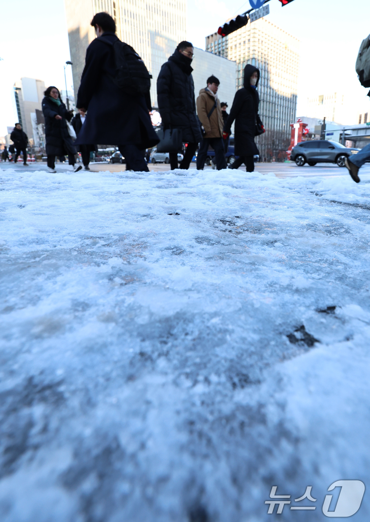 (서울=뉴스1) 구윤성 기자 = 폭설 후 한파로 도로 곳곳이 얼어붙은 5일 오전 서울 광화문역 일대에서 시민들이 출근길 발걸음을 옮기고 있다. 2025.12.5/뉴스1