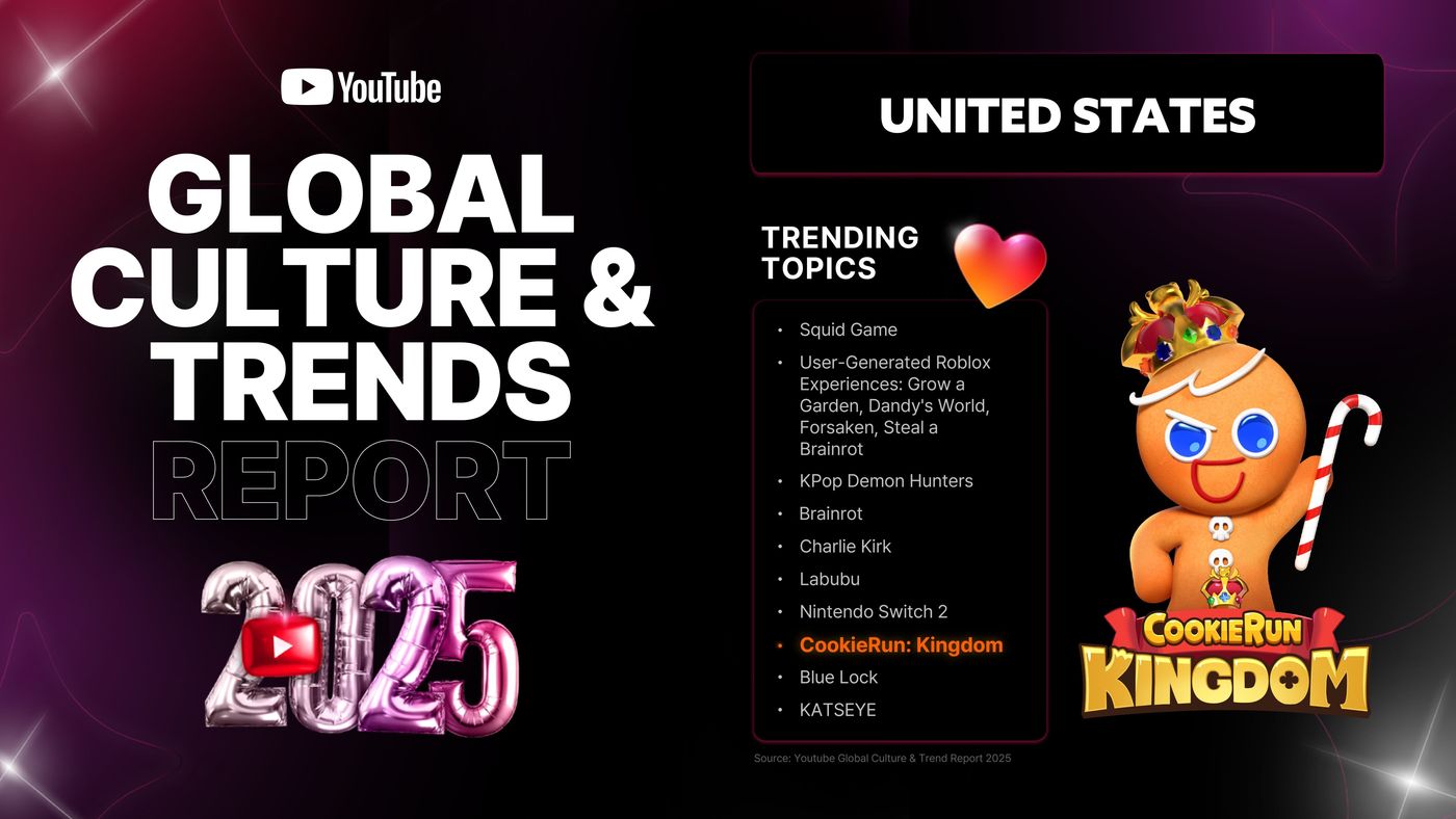 데브시스터즈는 '쿠키런: 킹덤'이 유튜브의 '2025년 글로벌 컬처 & 트렌드 리포트'에서 미국 지역 트렌딩 토픽 톱10에 선정됐다고 5일 밝혔다.