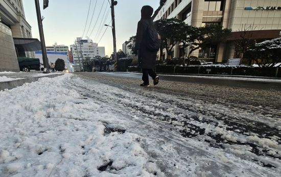 수도권 일대에 전날 내린 폭설이 밤새 영하권 추위에 서울 도심 도로 곳곳이 얼어 붙은 5일 제설작업이 미흡한 서울 중구의 한 이면도로를 지나는 시민들이 조심스럽게 발걸음을 옮기고 있다.