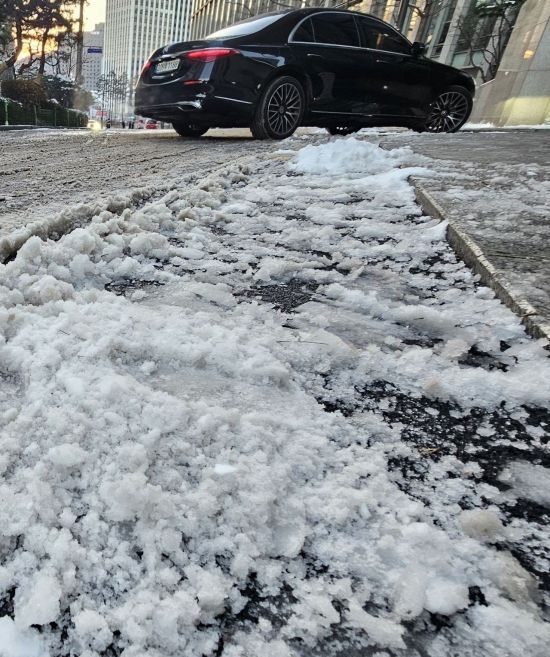 수도권 일대에 전날 내린 폭설이 밤새 영하권 추위에 서울 도심 도로 곳곳이 얼어 붙은 5일 제설작업이 미흡한 서울 중구의 한 이면도로를 지나는 차량들이 서행하고 있다.