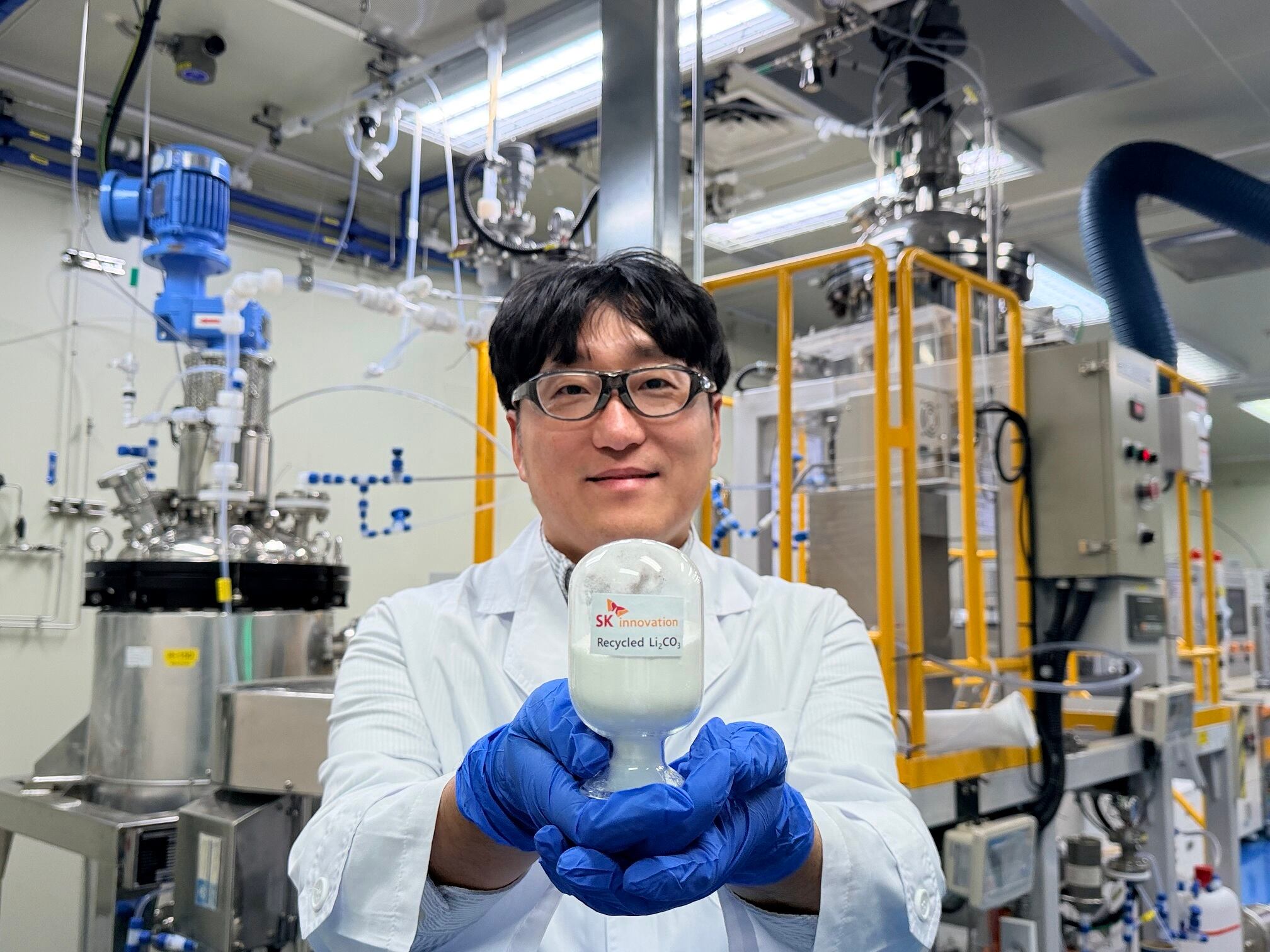 SK이노베이션 환경과학기술원 연구원이 LFP 배터리 재활용 기술을 통해 회수한 탄산리튬(Li₂CO₃)을 소개하고 있다. / SK이노베이션 제공 |