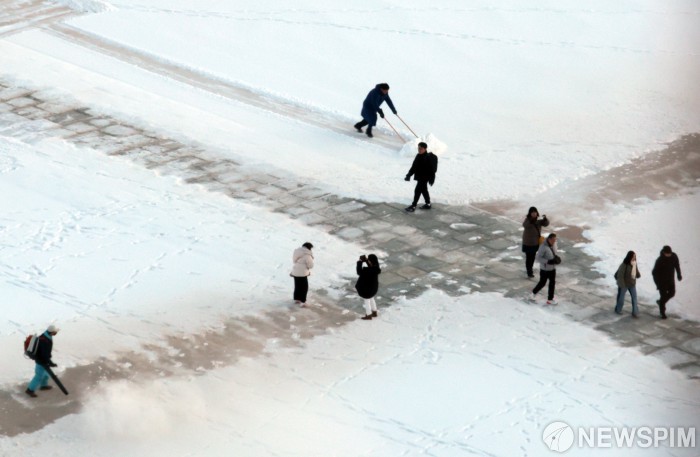 [서울=뉴스핌] 이길동 기자 =5일 오전 서울 종로구 경복궁에서 관계자들이 어젯밤 내린 눈을 치우는 가운데 관광객들이 눈을 배경으로 사진을 찍고 있다.2025.12.05 gdlee@newspim.com |