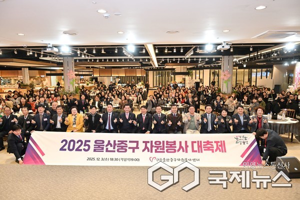 (울산=국제뉴스) 주영곤 기자 = (사)울산중구자원봉사센터(이사장 박민호)가 자원봉사자의 날(12. 5.)을 기념해 지난 12월 3일(수) 오후 6시 30분 시티컨벤션 안다미로홀에서 '2025 중구 자원봉사 대축제'를 개최했다고 밝혔다.