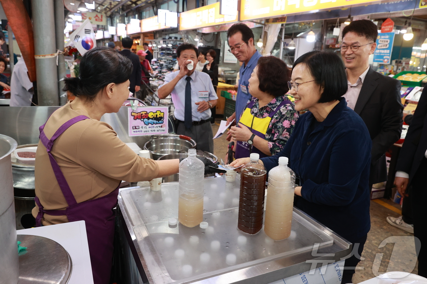 한성숙 중소벤처기업부 장관이 1일 서울 서대문구 독립문 영천시장을 방문해 물건을 구입하고 상인들을 격려하고 있다. (중소벤처기업부 제공. 재판매 및 DB금지) ⓒ News1 DB |