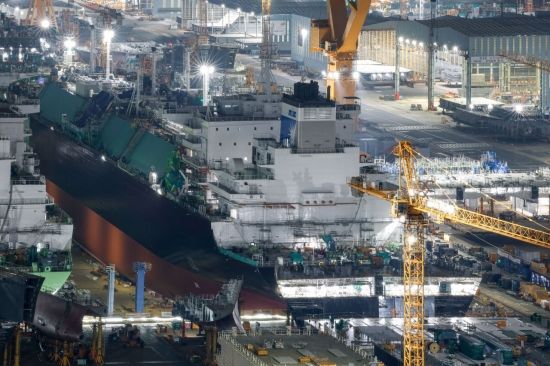 경남 거제 한화오션 옥포조선소 야드 도크에 가득찬 액화천연가스(LNG) 운반선. 강진형 기자 |