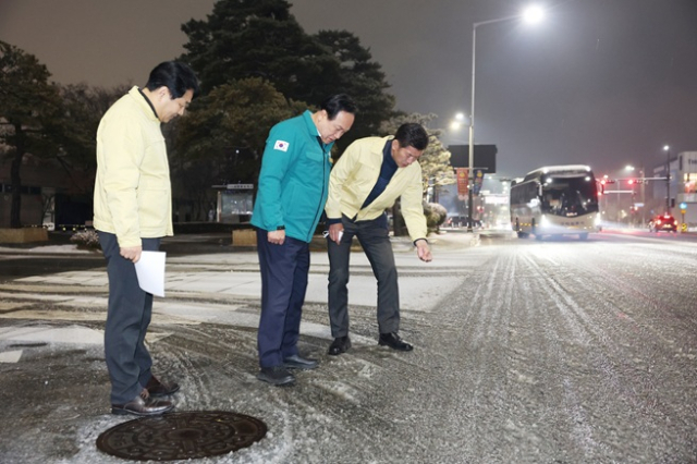 이 시장은 이날 오후 시청 재난상황실을 방문해 폭설 대응 태세를 점검하고 비상근무 중인 직원들을 격려했다. 이어 오후 7시 50분부터 경기대로 등 주요 도로 현장을 직접 점검하며 제설 상황과 결빙 구간의 제설제 살포 현황을 살폈다.