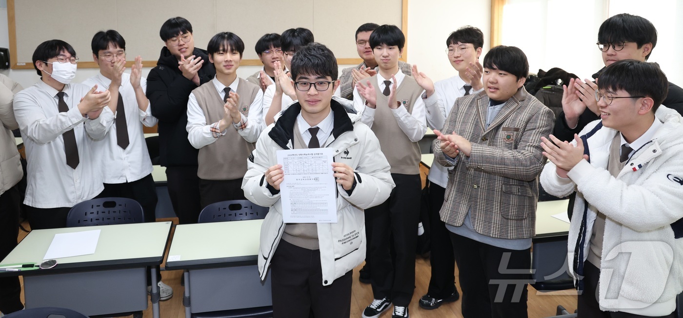 (전주=뉴스1) 유경석 기자 = 2026학년도 대학수학능력시험 성적표 배부일인 5일 전북 전주시 한일고등학교에서 수능 만점자 이하진 학생이 친구들의 축하를 받고 있다. 2025.12.5/뉴스1