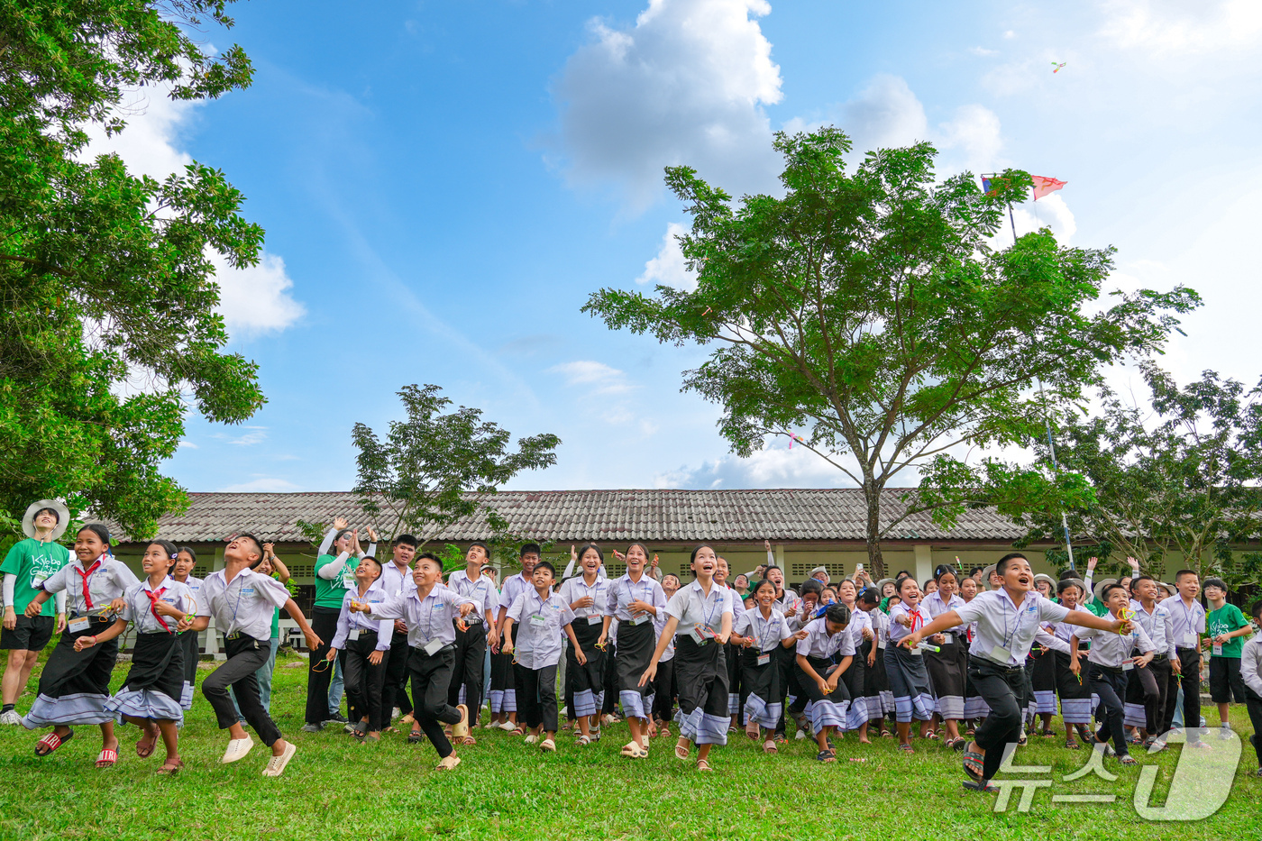 지난달 12일 교보다솜이글로벌봉사단과 라오스 방비엥에 위치한 힌후아쓰아 중고등학교 학생들이 운동장에서 함께 새총을 날리고 있다./사진제공=교보생명 |