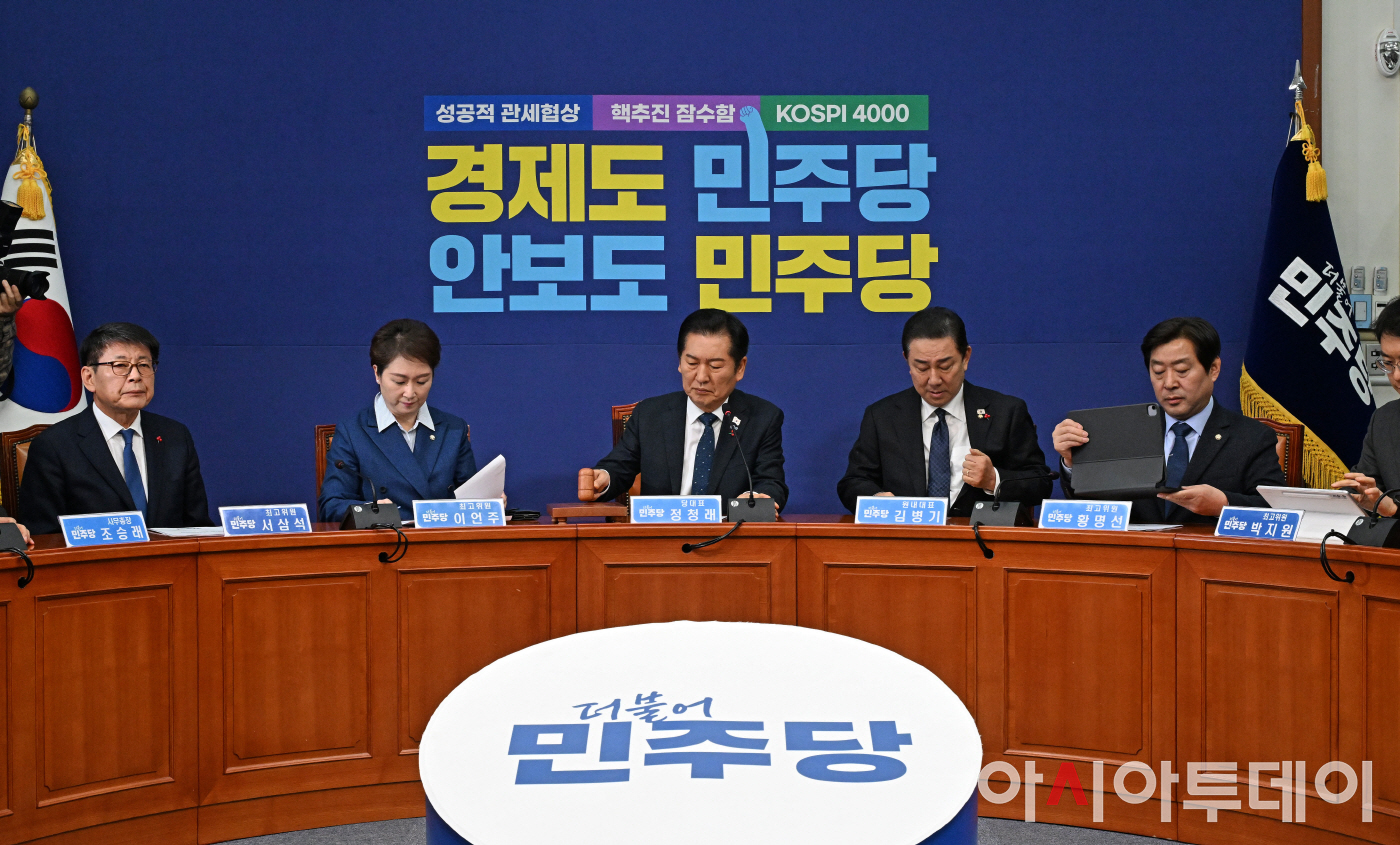 아시아투데이 송의주 기자 = 정청래 더불어민주당 대표(가운데)가 5일 국회에서 열린 최고위원회의에서 의사봉을 두드리고 있다.