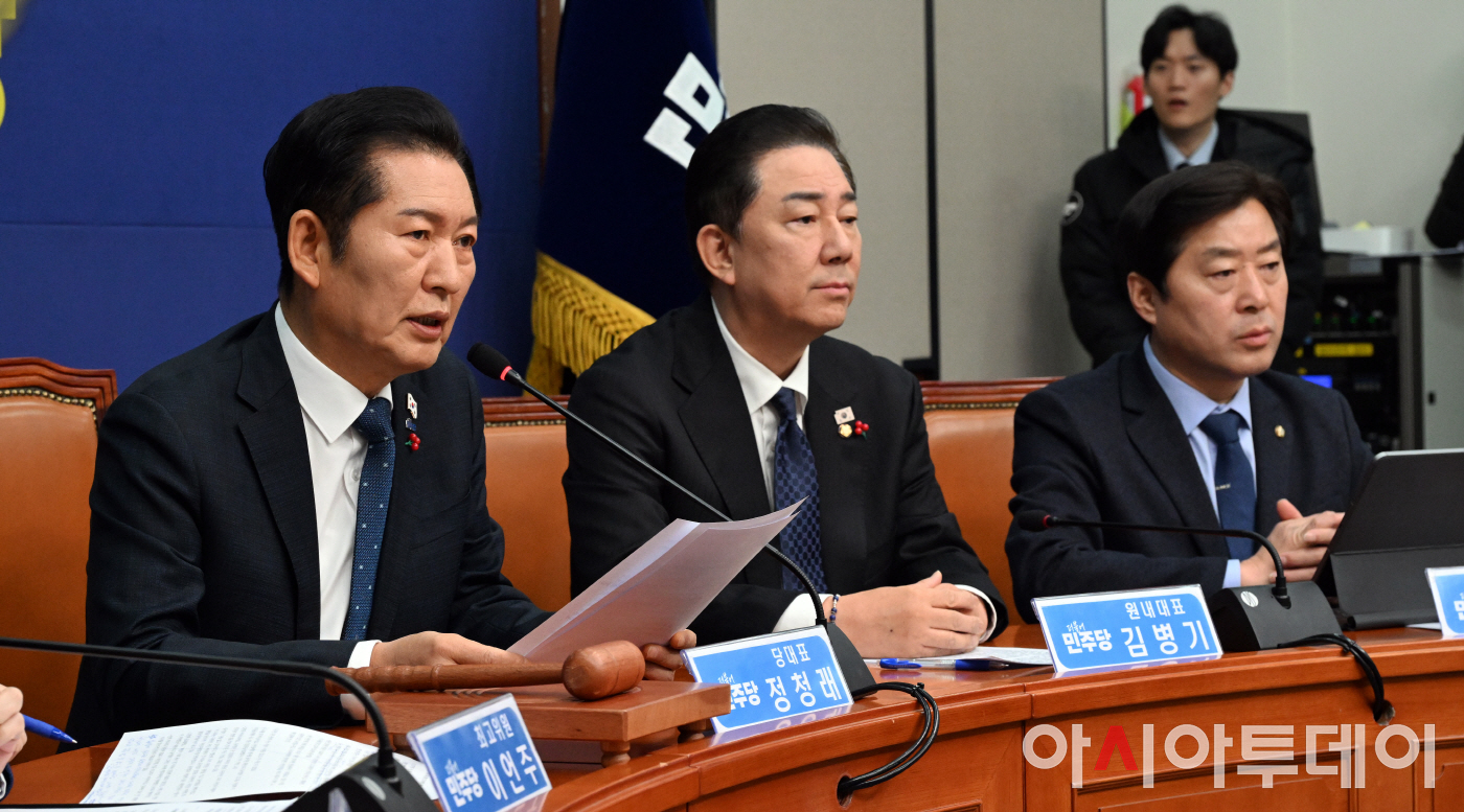 아시아투데이 송의주 기자 = 정청래 더불어민주당 대표(맨 왼쪽)가 5일 국회에서 열린 최고위원회의에서 발언을 하고 있다.