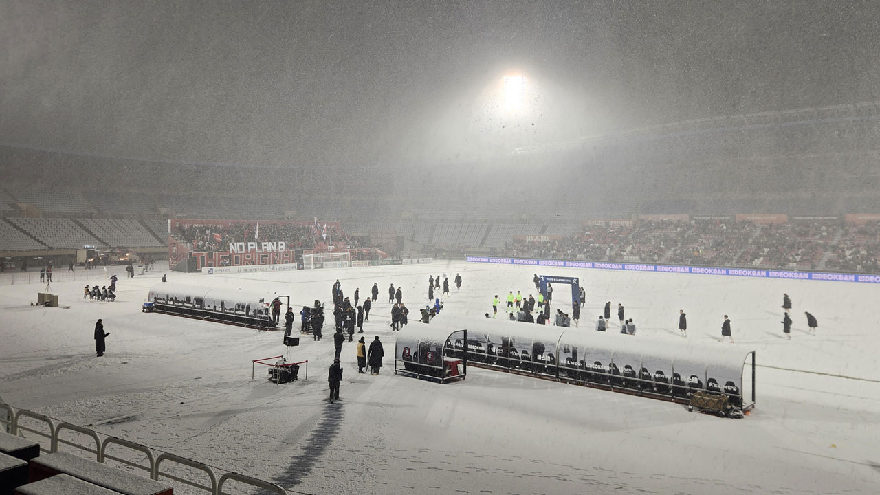 많은 눈이 쏟아지면서 그라운드 라인이 보이지 않을 정도로 덮였고, 결국 경기감독관은 안전상 경기 개최가 어렵다며 양 팀 감독의 동의를 받아 최종적으로 취소를 결정했습니다.
