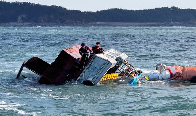충남 태안 해상에서 전복된 어선 선원을 태안해양경찰 구조대원들이 구조하고 있다. 태안해경 제공 |