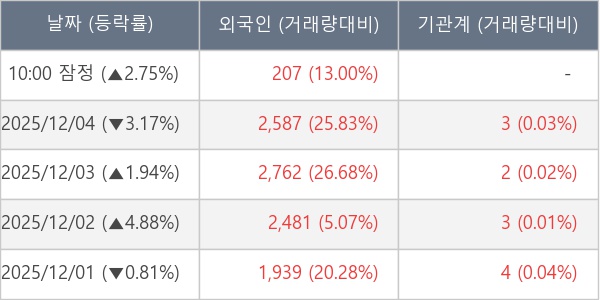 [서울=뉴스핌] 로보뉴스 = 05일 10시 15분 현재 이지트로닉스(377330)는 전일 대비 2.75% (현재가 3,920원) 상승했고, 외국인이 최근 6일 연속 순매수(누적 11,818주, 잠정) 행진을 하고 있다.