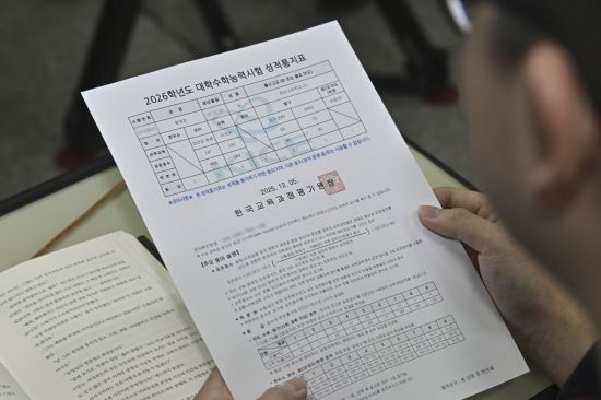 2026학년도 대학수학능력시험 성적표 배부일인 5일 서울 광진구 광남고등학교에서 '수능 만점자' 왕정건 학생이 성적표를 살펴보고 있다.