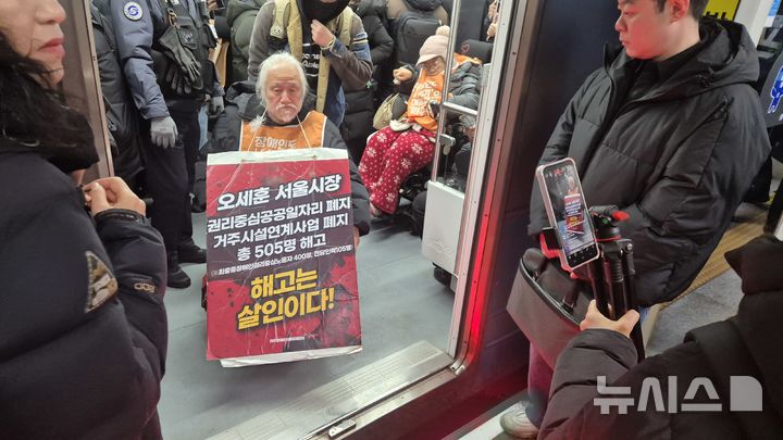 [서울=뉴시스] 전상우 수습기자 = 박경석 전국장애인차별철폐연대(전장연) 상임공동대표가 5일 오전 서울 지하철 4호선 혜화역 열차 안에서 장애등급제 폐지와 권리중심일자리 최중증장애인노동자 해고 철회를 촉구하며 선전전을 벌이고 있다. 2025.12.05. swoo@newsis.com |