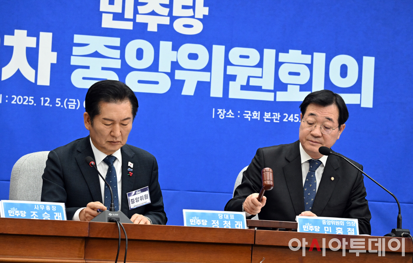 아시아투데이 송의주 기자 = 민홍철 더불어민주당 중앙위원회 의장이 5일 국회에서 열린 제3차 중앙위원회의에서 의사봉을 두드리고 있다. 왼쪽은 정청래 대표.
