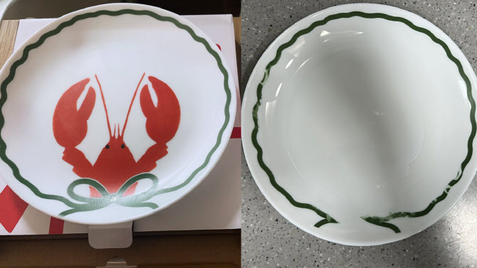 게시글 속 사진에는 접시 하단에 그려진 랍스터 그림의 왼쪽 집게발 프린팅이 완전히 사라지거나 전체 그림이 뜯기듯 지워진 모습이 담겼다. 세척 과정에서 프린팅이 떨어지는 것은 물론 핫소스 등 산성 식품이 닿자 순식간에 녹아내리듯 사라졌다는 증언도 이어졌다.