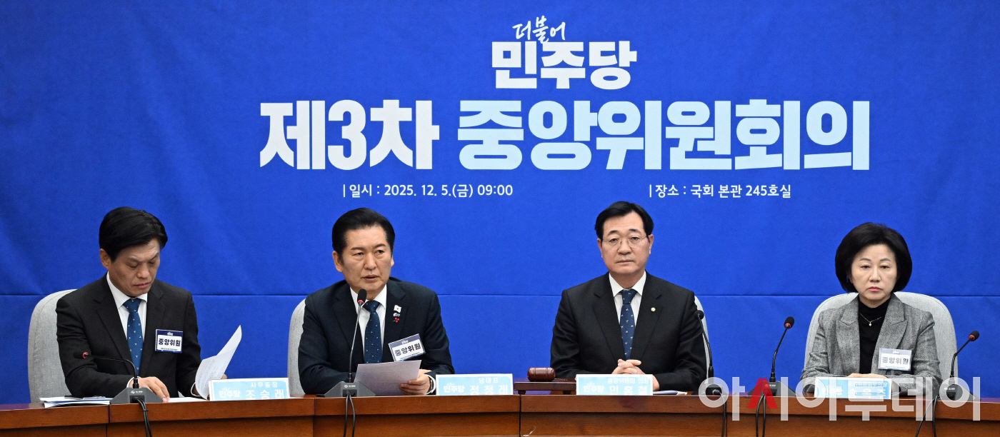 아시아투데이 송의주 기자 = 정청래 더불어민주당 대표(왼쪽에서 두번째)가 5일 국회에서 열린 제3차 중앙위원회의에서 발언을 하고 있다.