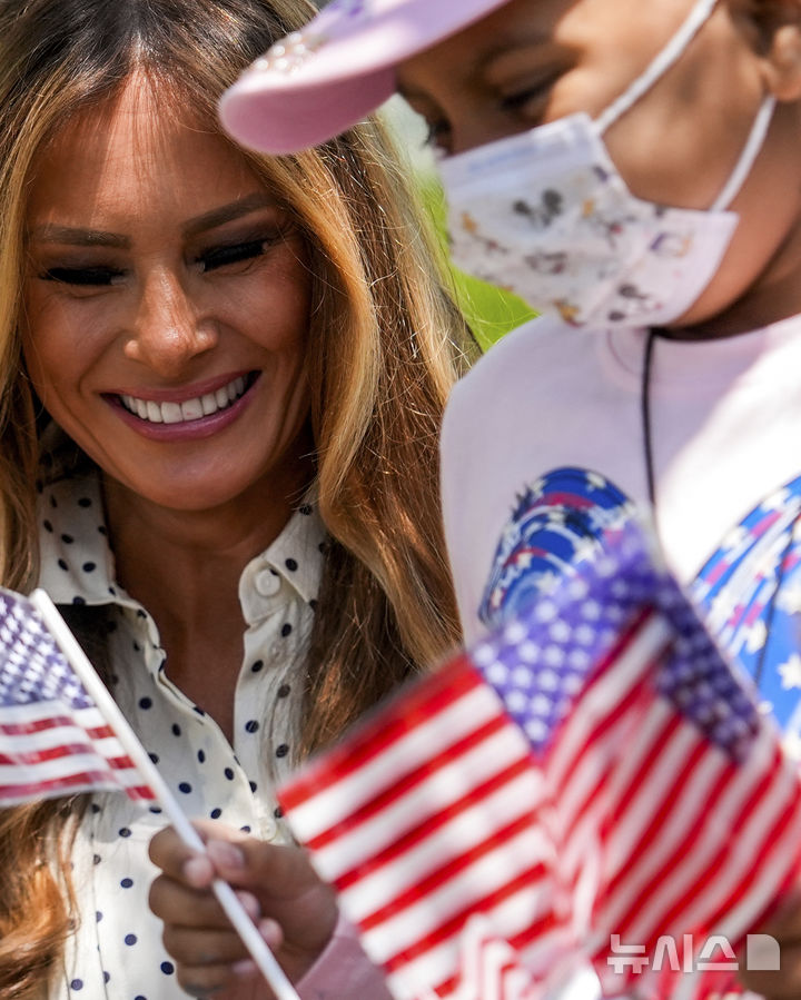 [워싱턴=AP/뉴시스] 러시아에 끌려갔던 우크라이나 어린이 7명이 멜라니아 트럼프 여사의 중재로 가족의 품으로 돌아갔다고 여사 측이 4일(현지 시간) 밝혔다. 자료 사진은 지난 7월 3일 미 워싱턴 아동국립병원에서 어린이 환자와 정원에 성조기 바람개비를 설치하는 모습. 2025.12.05. |