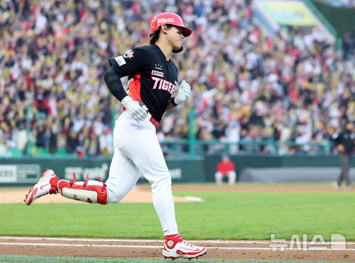 [인천=뉴시스] 이영환 기자 = 11일 오후 인천 미추홀구 SSG랜더스필드에서 열린 2025 프로야구 KIA 타이거즈와 SSG 랜더스의 더블헤더 2차전 경기, 4회초 1사 주자없는 상황에서 KIA 김도영이 솔로 홈런을 날린 후 베이스를 돌고 있다. 2025.05.11. 20hwan@newsis.com |