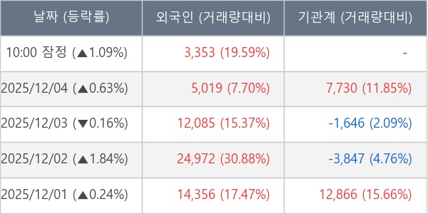 [서울=뉴스핌] 로보뉴스 = 05일 10시 15분 현재 진성티이씨(036890)는 전일 대비 1.09% (현재가 12,940원) 상승했고, 외국인이 최근 5일 연속 순매수(누적 59,785주, 잠정) 행진을 하고 있다.