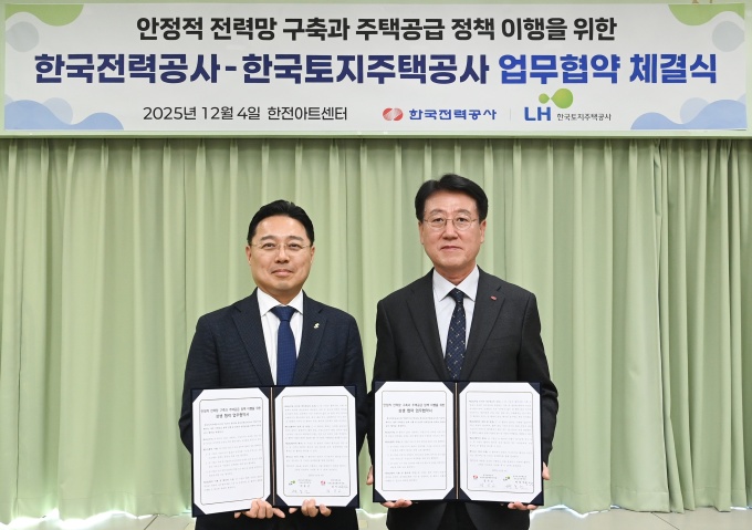 한국전력은 지난 4일 서울 한전아트센터에서 한국토지주택공사(LH)와 '안정적 전력망 구축과 주택공급 정책 이행'을 위한 업무협약(MOU)를 체결했다. [사진=한국전력] 2025.12.05 lahbj11@newspim.com |